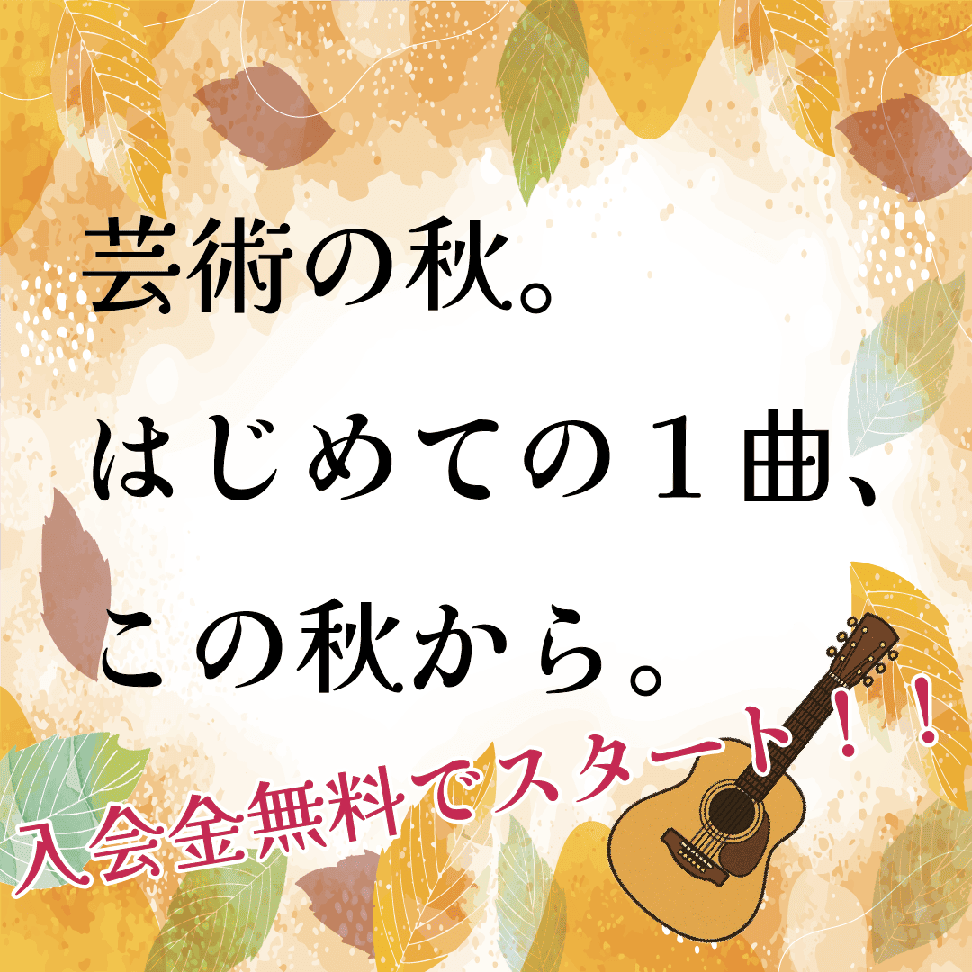 今だけのチャンス!この秋、ギターを始めてみませんか? ただいま当教室では、期間限定で入会金(通常4,400円)が無料になるキャンペーンを実施中です!「芸術の秋」にぴったりのこの機会に、ギターのある毎日をスタートしてみまし